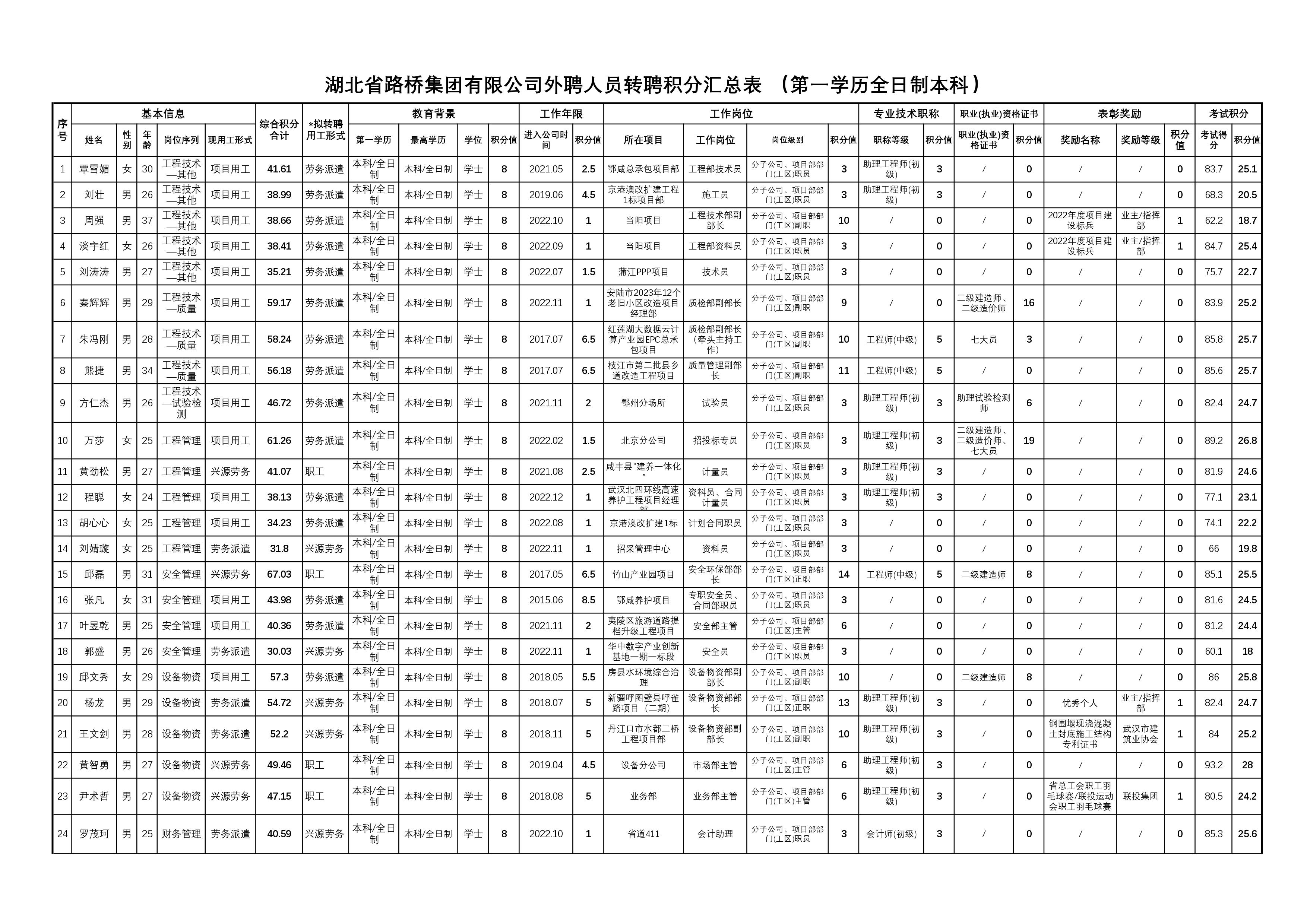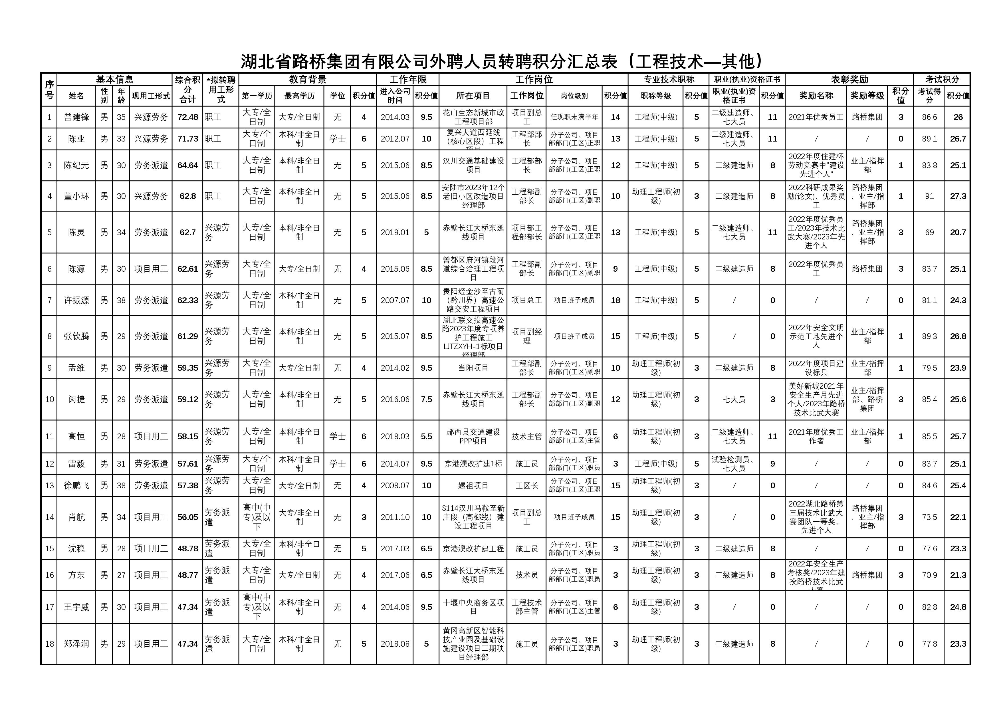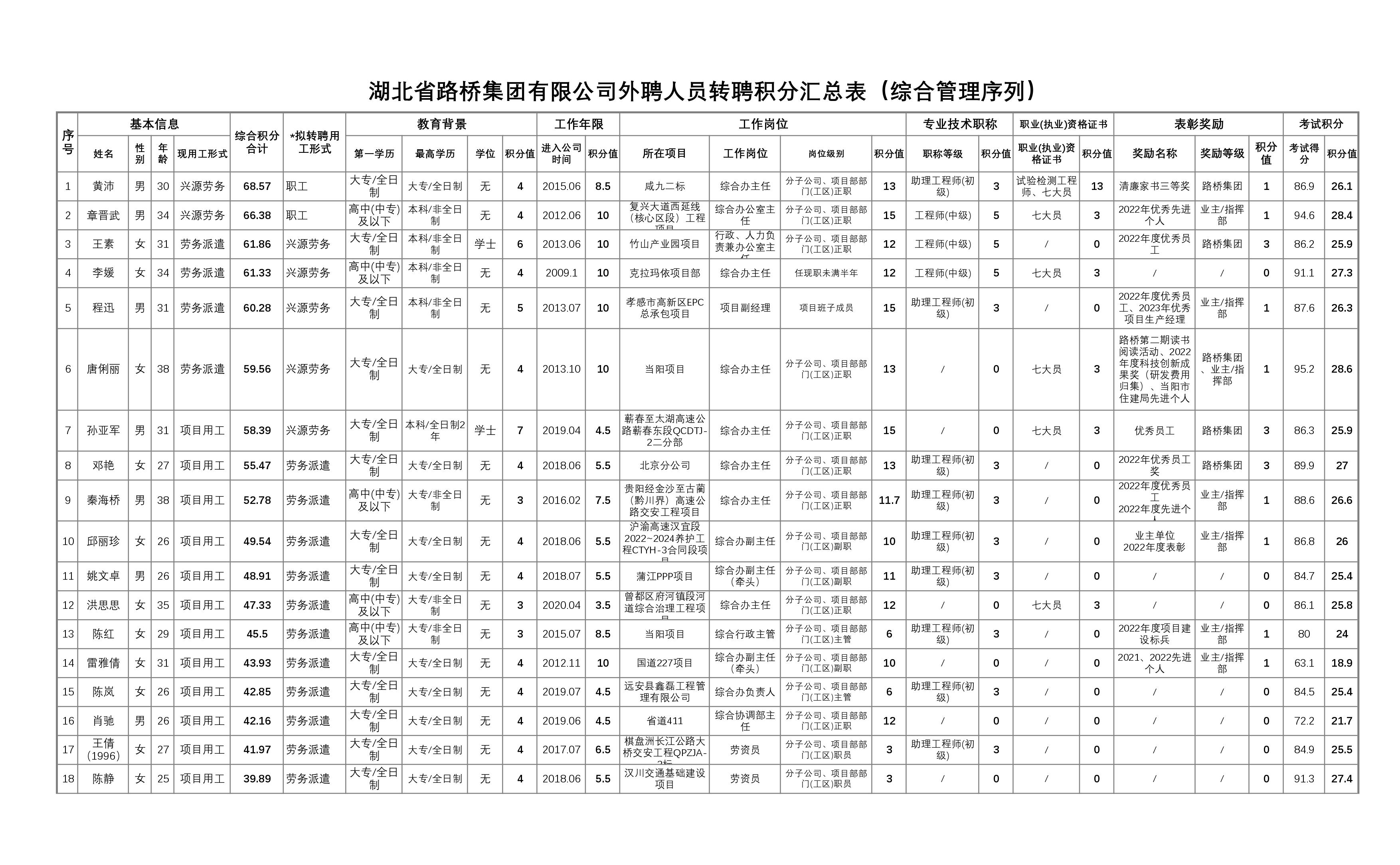 湖北省路橋集團有限公司2023年擬轉聘人員公示