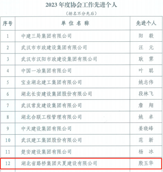 初心如磐守安全,砥礪奮進譜新篇。近日,武漢建設安全協會就2023年建筑行業安全生產方面評選了一批先進單位和先進個人,湖北路橋天夏公司榮獲“2023年度協會工作先進單位”稱號,天夏公司副總經理殷玉華、安全總監付建國榮獲“2023年度協會工作先進個人”稱號。