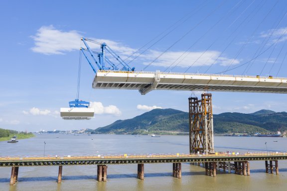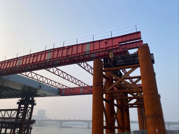 依托丹江口市水都二橋工程,研發(fā)了大噸位龍門(mén)吊與鋼梁拼裝平臺(tái)共用支架技術(shù)、大跨徑大斷面鋼箱梁拼裝線(xiàn)性變形控制技術(shù)及鋼箱梁節(jié)段精準(zhǔn)對(duì)接補(bǔ)強(qiáng)連接技術(shù),解決了龍門(mén)吊支架與鋼梁拼裝平臺(tái)支架交叉混亂、龍門(mén)吊軌道場(chǎng)地要求高的難題,提高了鋼箱梁節(jié)段對(duì)接安裝精度和連接強(qiáng)度,在有效工期內(nèi)完成了各項(xiàng)指標(biāo),獲得社會(huì)各方的高度好評(píng)。