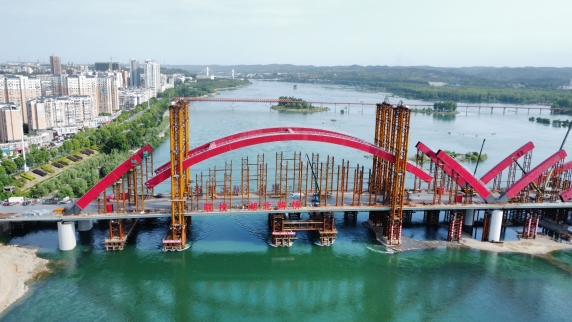 依托丹江口市水都二橋工程,研發(fā)了一種拱肋原位支架快速安拆技術(shù)、拱肋吊裝高空精確調(diào)整定位技術(shù)、多因素影響鋼箱拱肋溫差變形預(yù)測(cè)技術(shù),提出了中跨拱肋低位拼裝同步提升合龍技術(shù),研制了液壓動(dòng)力系統(tǒng)提升裝置,采用了視覺(jué)位移監(jiān)測(cè)系統(tǒng),提高了拱肋原位支架安拆效率,全方位確保拱肋提升質(zhì)量與安全。