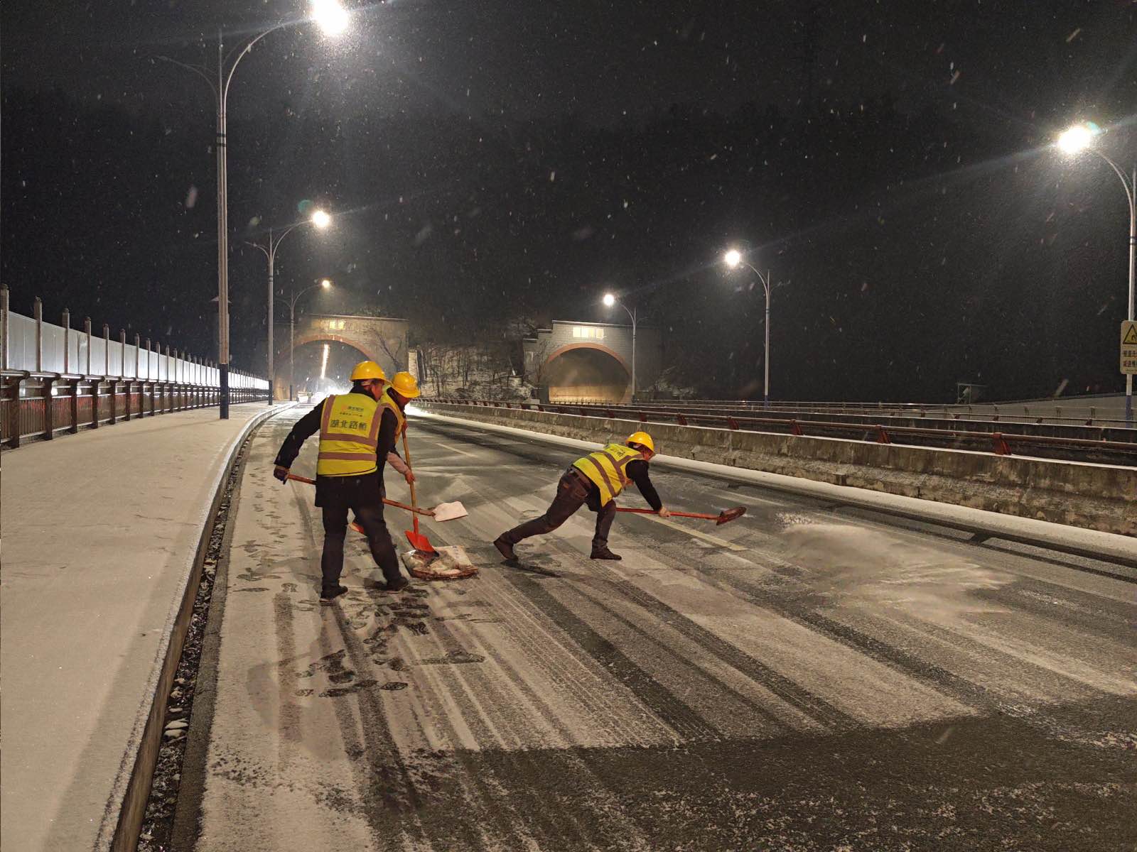 面對強降雪導致的交通公路路面結冰打滑,以及建筑工地施工通道、運輸要道積雪結冰的雙重隱患,五峰建養01包項目部迅速啟動冰雪應急預案,組建專業搶險隊伍,提前儲備了足量環保型融雪鹽、鐵鍬等應急物資,明確“先公路主干道、后工地關鍵區”作業邏輯,搶險隊伍兵分兩路展開作業:公路組駕駛皮卡車沿責任路段勻速行駛,重點對橋梁、彎道、坡道等易結冰部位精準撒布融雪鹽;工地組采用“機械+人工”的協同模式,由撒鹽車全面覆蓋主干道,作業人員則手持工具對施工便道、材料堆場、腳手架通道等機械作業死角進行補撒,同時嚴格控制融雪鹽用量,避免設備受到腐蝕,全體搶險人員實行24小時輪班巡查制度,每2小時檢測一次路面防滑情況,累計撒布融雪鹽3噸,清理積雪結冰路面6公里,確保了周邊公路全線暢通和工地施工通道無結冰隱患。