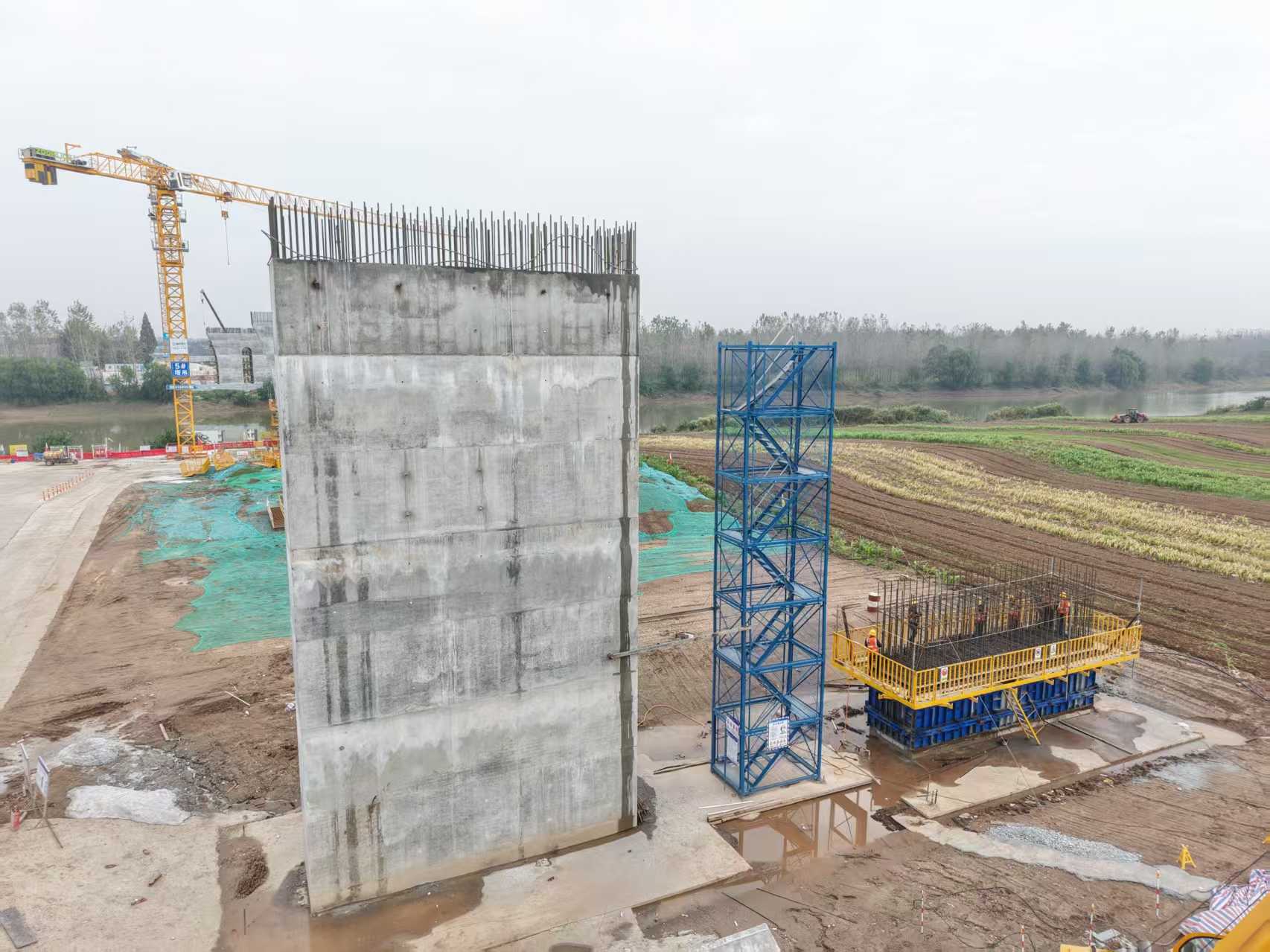 本次封頂的4#過渡墩是連接松虎河引橋與主橋的關鍵墩位,采用分離式矩形實體墩設計,具有結構穩定、承載能力強的特點。墩身橫橋向寬9米、順橋向寬2.2米,采用C40高性能混凝土現澆工藝,澆筑方量達317.1立方米。為保障混凝土強度與耐久性,施工完成后立即啟動定時自動噴淋養生系統,通過智能控制濕度與頻次,有效預防混凝土表面裂縫,確保墩身結構質量。